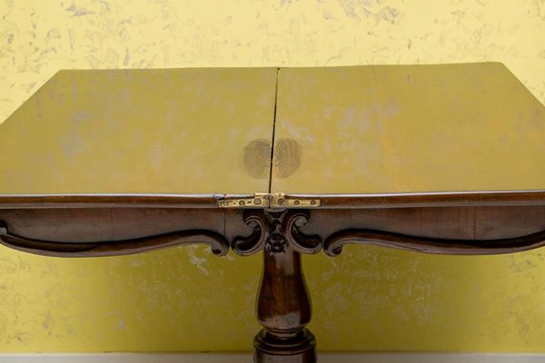 In mahogany, with 4 comma-shaped support feet, column stem, front of the top with carved hedgehog. The object can only be viewed in the photo and must be collected directly from the owner's house, by appointment (Rome)