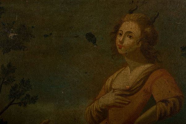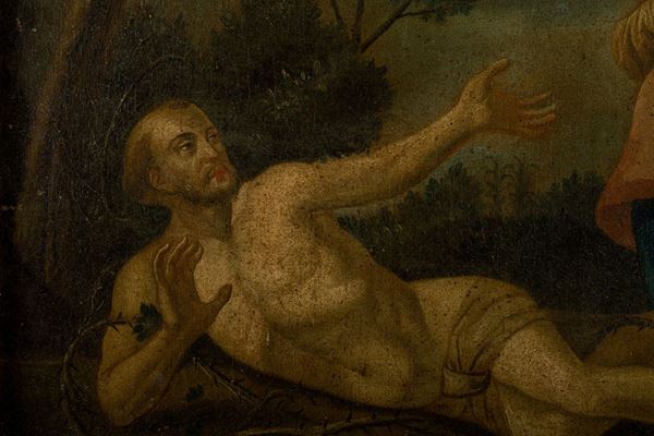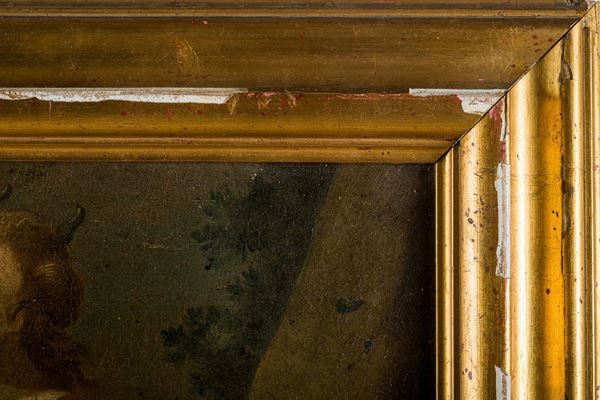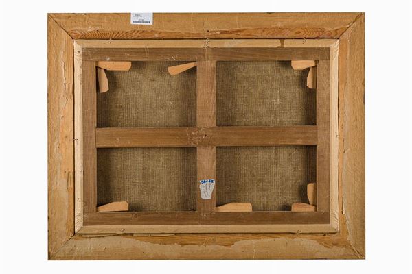 In a non-coeval gilded frame, with losses of gilding in several places. Relined work with small drops of color scattered on the bottom.