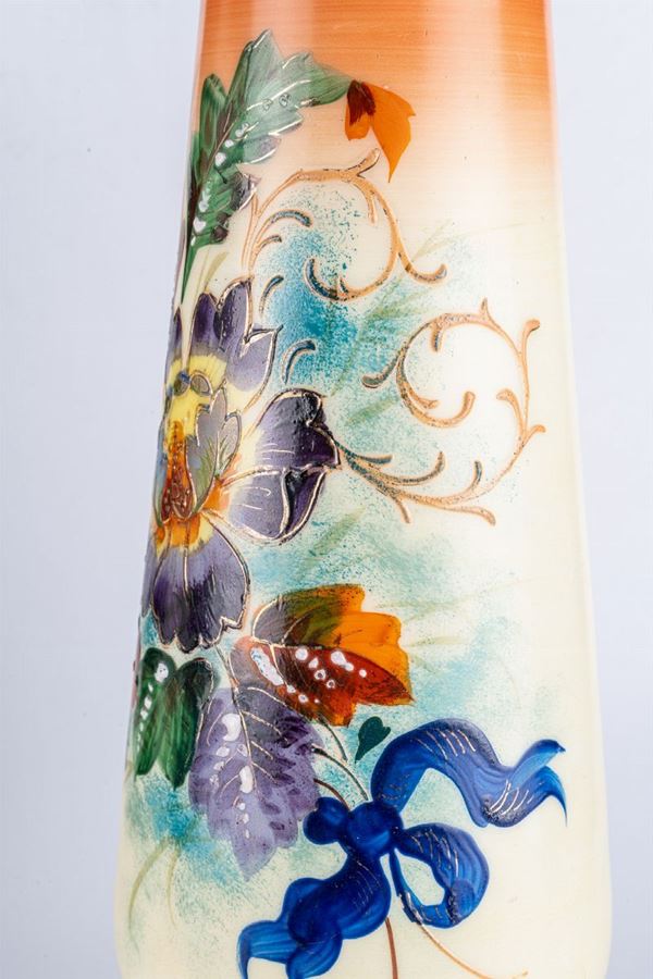 In glass paste like a baluster, with a circular foot in cream color, with polychrome floral decoration.