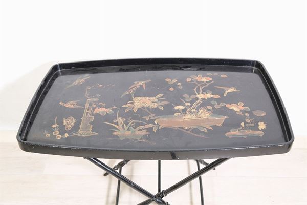 in black lacquer wood and floral decoration in gold and polychrome, with en suite base with crossed rods. Tray dimensions: 81 x 48 x 4 cm. Base dimensions: 53 x 29 x 55 cm.