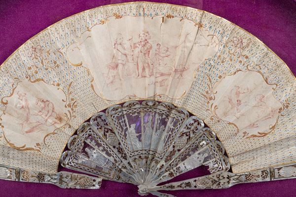 and painted parchment, with openwork slats and fabric decorated with gallant scenes within gilded reserves. Contemporary case in gilded wood and purple velvet. Broken parts.