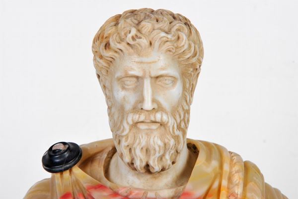 Sculpture in volume composed of onyx bust, head in Carrara marble and base and button in black Belgian marble.