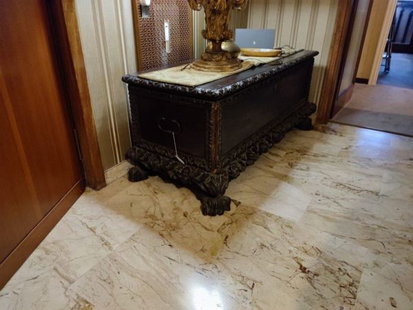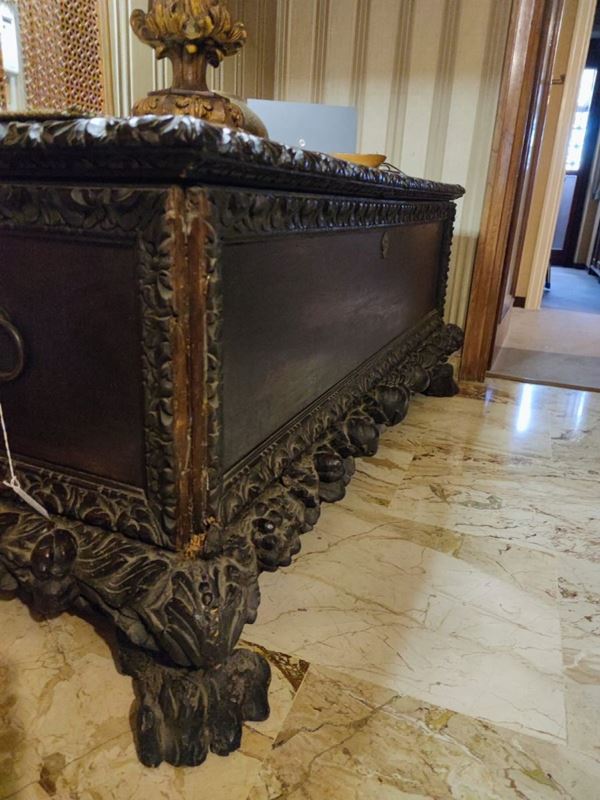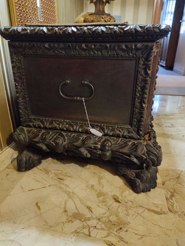 In ebonized wood, Neo-Renaissance style, rectangular shape, with feral feet, moldings and side squares carved with plant motifs. The object can only be viewed in the photo and must be collected directly from the owner's house, by appointment (Rome)