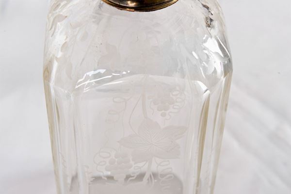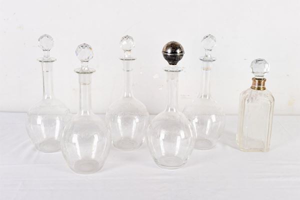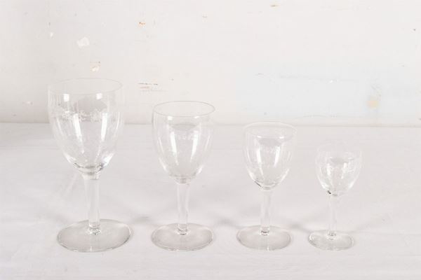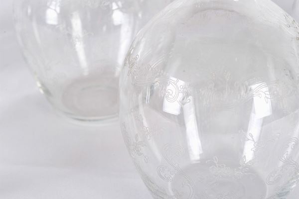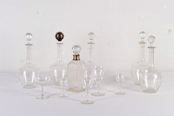 in Murano glass, part engraved, 5 different sizes, for a total of 82 pieces, and 6 glass bottles, part engraved.
