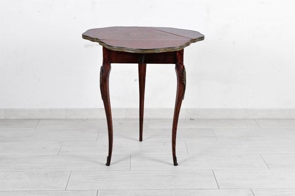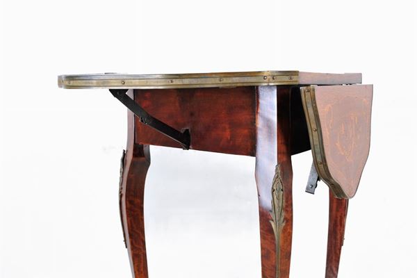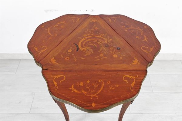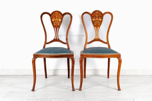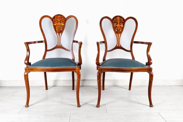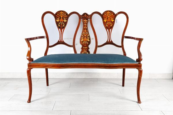 composed of 2 armchairs (81 x 55 x 48 cm), 4 chairs (90 x 44 x 45 cm), two-seater sofa (92 x 110 x 51 cm), small table with 3 flaps (75 x 45 x 51 cm). Petrol blue velvet upholstery, inlaid and threaded parts.