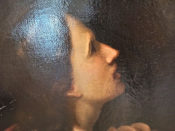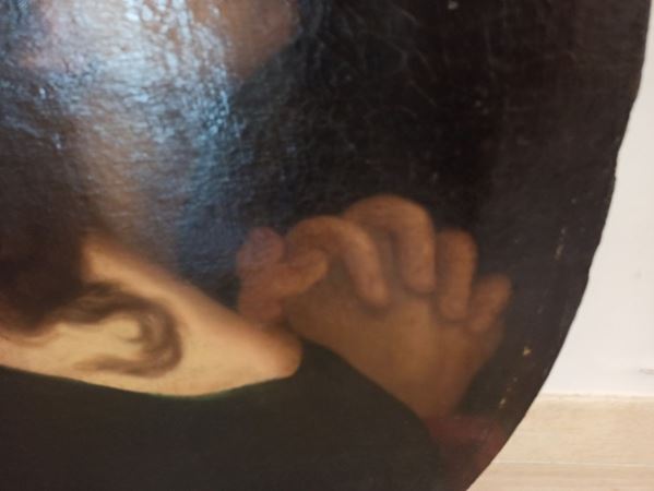 The painting, relined and probably belonging to a bigger work representing Christ's crucifixion, shows small repaintings on the Saint's face. Drop of colors, as well as a white paint stain on the left side of the painting are noticeable