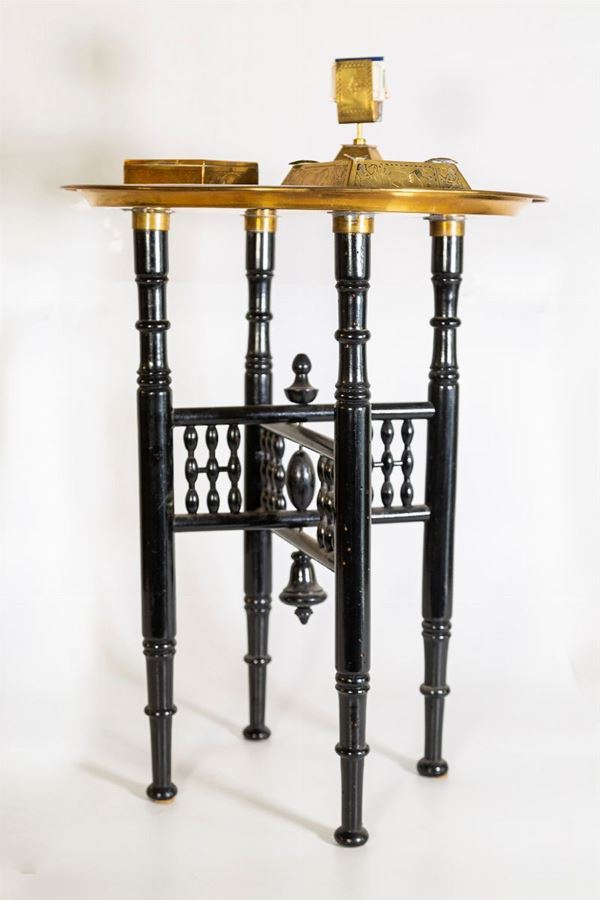 Consisting of: table with engraved brass top, cigarette holder, ashtray and engraved brass match holder. Base in ebonized wood with 4 lathe columns.