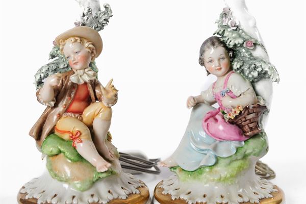 In white porcelain, anthropomorphic body, with boy and girl, circular base. Polychromy in beige and pink, cream and green shades. Finishes in pure gold. A restored lamp, small shortcomings. N mark crowned underglaze.