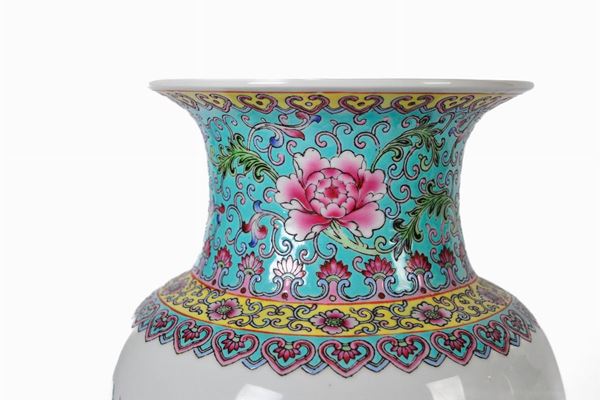 In porcelain, egg-shaped body, splayed on the neck, with everted edge and ring edge. Peony decoration with birds on a white background on the front, poetry on the reverse. Small crack in the enamel. With bases in ebonized wood.