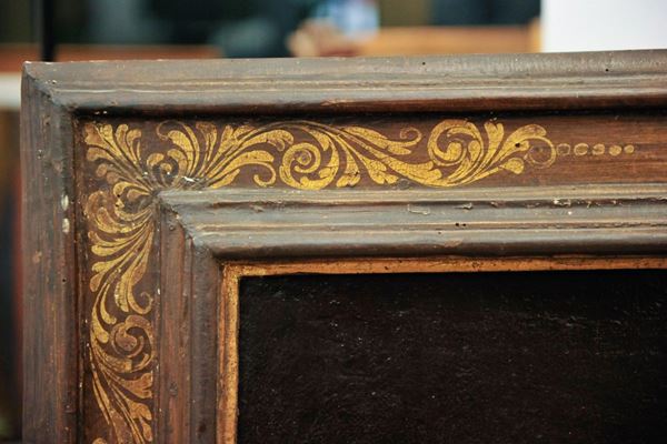 The painting is located within a coeval frame in lacquered wood, which is missing. We also note the presence of restorations.
