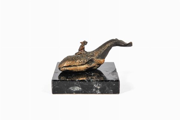 Volume sculpture in bronze, on a black marble base. Signed Possenti on the side of the whale.