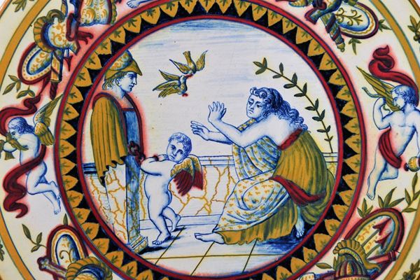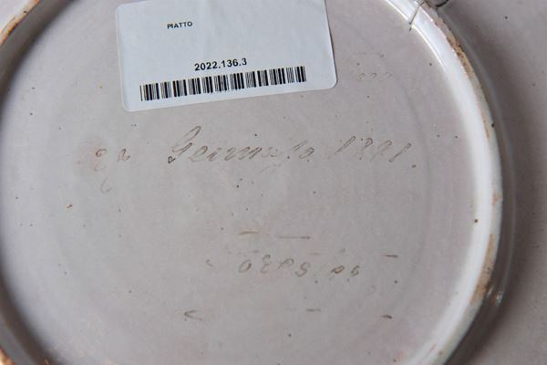 in luster ceramic, with a mythological scene of invention in the hollow and brim with double decoration, with weapons, cherubs and floral elements. Dated and initialed on the back.