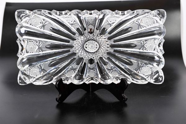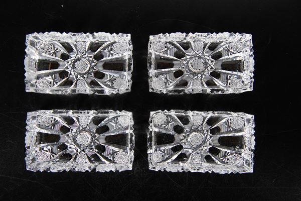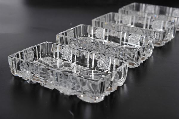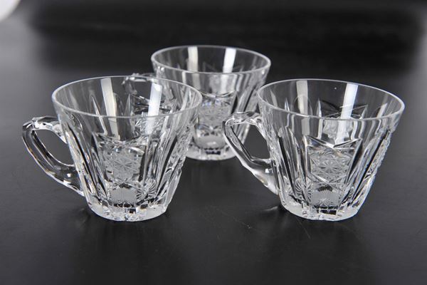 in counter-cut crystal, consisting of 8 bell-shaped cups with handle (dimensions: 7 x 4 cm) and 4 sauce bowls (dimensions: 13 x 7.5 x 2.5 cm), a tray (dimensions: 34.5 x 17.5 x 2.8 cm).