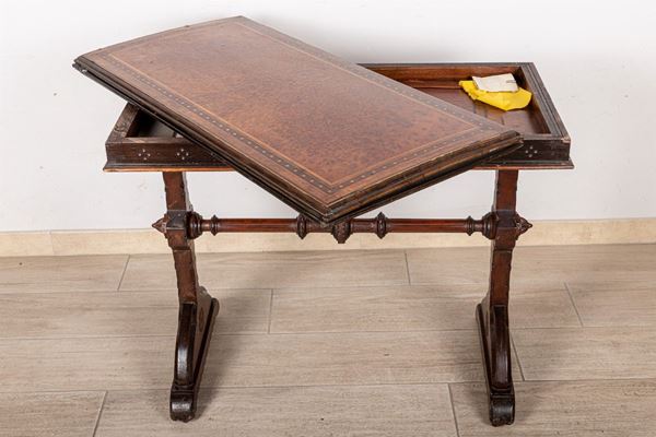 Booklet, with openable top, finished with free inlays in fruit wood and briar of tullia. Plinth legs ending in a crescent shape connected under the table.