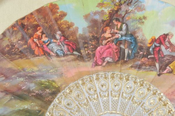 in painted fabric, with a polite genre scene and bakelite sticks, within a golden crescent frame.