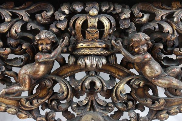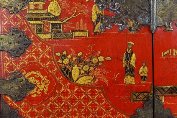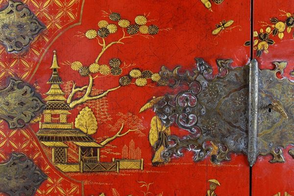 in red and gilded lacquered wood, with oriental motifs, on a coeval console in carved gilded wood. Consisting of two doors and internal chest of drawers, consisting of 13 drawers. Bronze gaskets. Small falls in the gilding. Epoque William & Mary.
