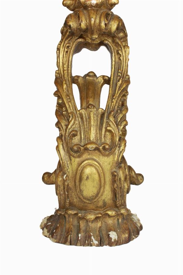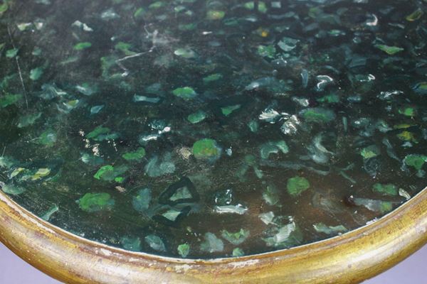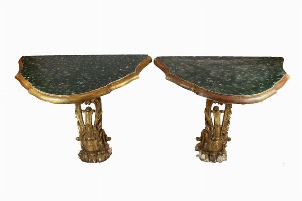 Wood. Baroque in taste. Stem in gilded wood with vegetable scrolls, semi-elliptical top with a mixtilinear outline, marbled in green. Gilding partly missing from the bases.