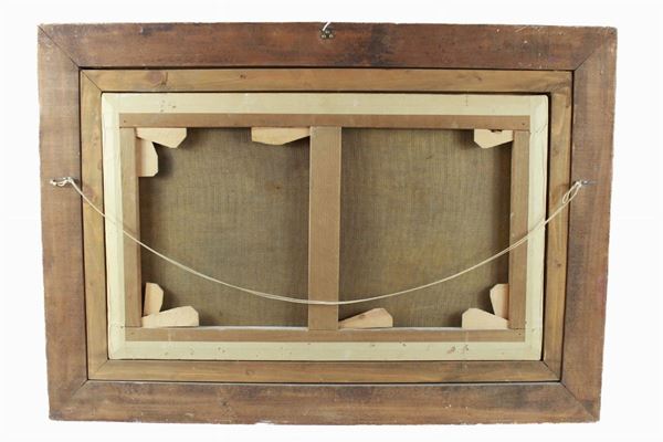 Within a gilt frame. It has repaintings, especially on the upper left part.