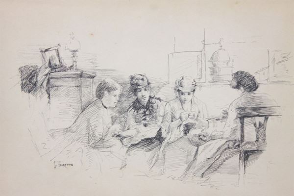 The subject may recall the famous painting now kept in the Galleria Civica in Turin, 'In sartoria (Embroideries)', probably executed for the 1878 Universal Exposition in Paris: although it cannot be considered a preparatory drawing, as it differs from the composition of the painting , are certainly present at affinity thanks to which we could ascribe the design to the production of the same years. We point out that in 2014 an ink and pen drawing similar to the one presented here appeared on the market, but slightly different in size and execution technique (Boetto, 10/06/2014, lot no. 517). Within frame.