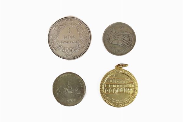 Composed of: commemorative medal with Galileo Galilei, in gilded silver 800/1000 (weight: 13.1 gr); 2 500 lire coins, in 850/1000 silver (Weight: 22 g); 1 commemorative coin of the provisional government of Lombardy, commemorative copy, in 925/1000 silver (Weight: 30.5 gr).