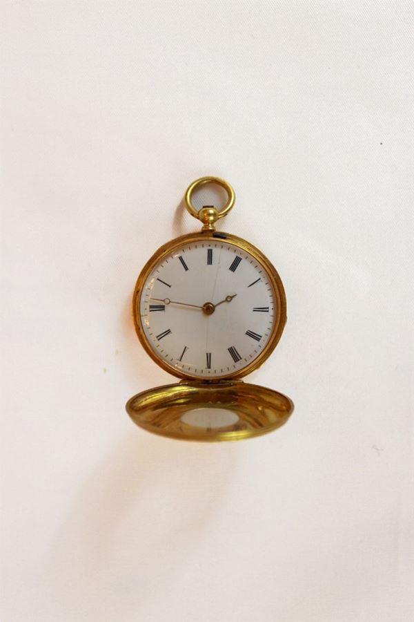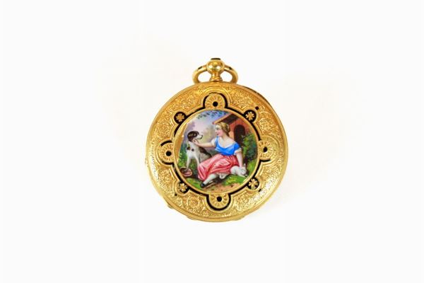 Double case, dial with blue enamelled Roman numerals, with gender scene on the back, enamelled, with partial color drop. Machine not running.