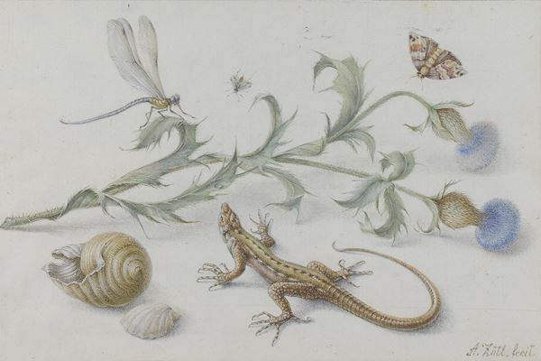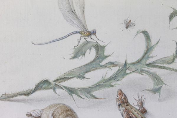 Studio di libellula, lucertola, farfalla e conchiglie su rametto di cardo
