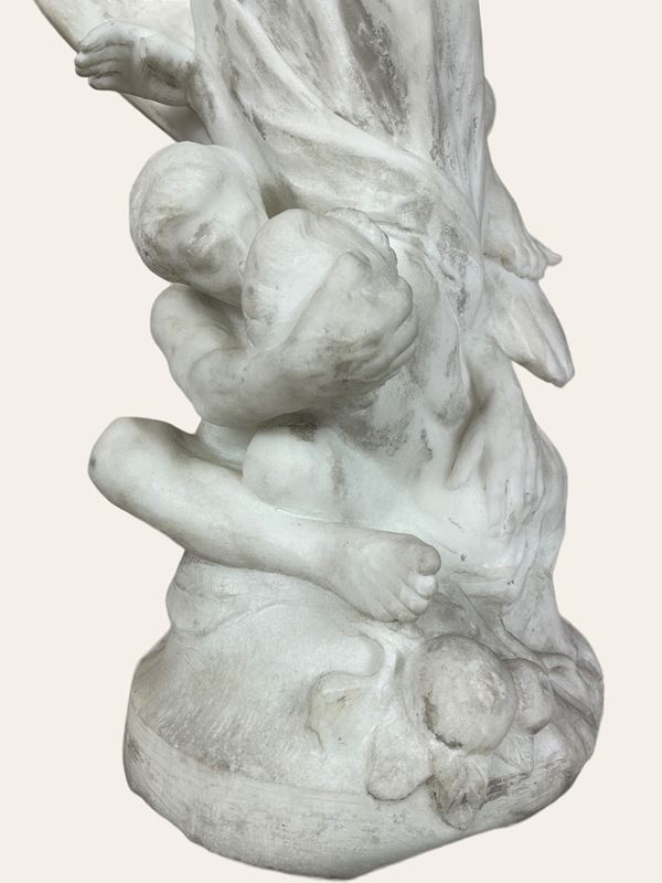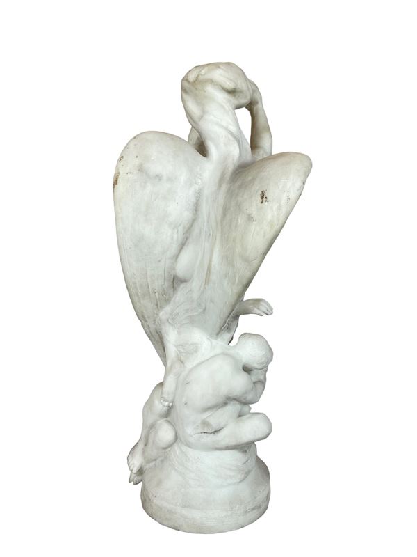Scultura in volume, in marmo bianco, opera d'accademia, di gusto simbolista. Mancante di un dito alla mano e di una gamba