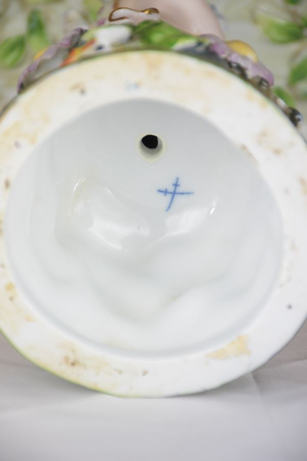 In porcellana policroma, vasca a conchiglia e corpo a putti e base a rocce e fiori a rilievo. Due spade incrociate sottosmalto