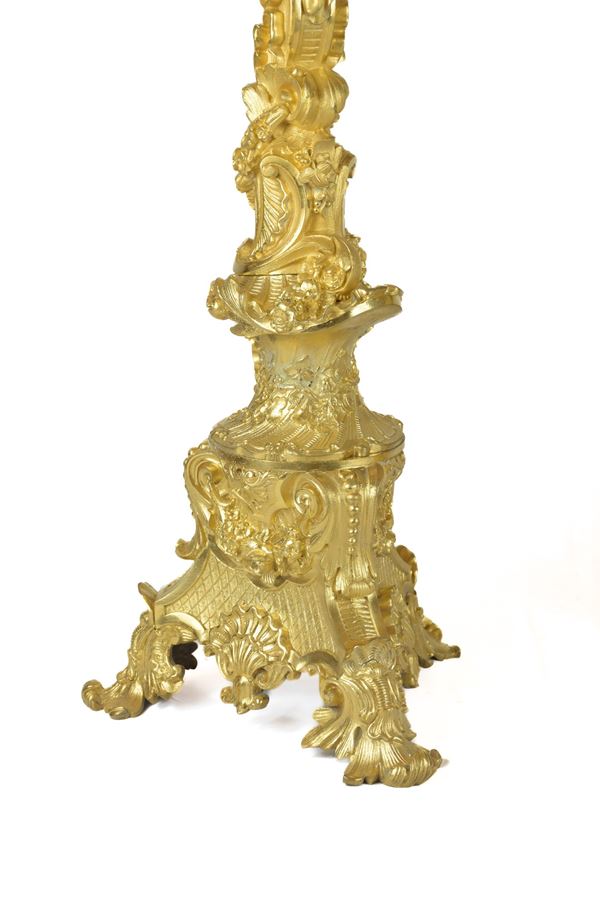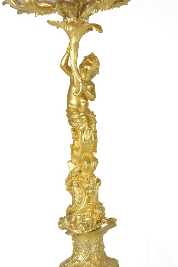 Coppia di candelieri a sei luci, in bronzo dorato, di gusto barocco, corpo a forma di putto su base rocciosa, desinente con base triangolare a tre piedi d'appoggio di forma floreale. Parti incise, parti in rilievo con decori a forme floreali e racemi.