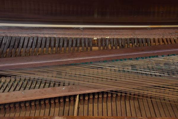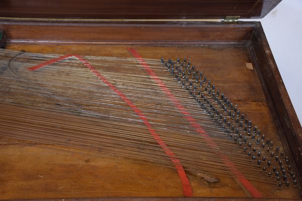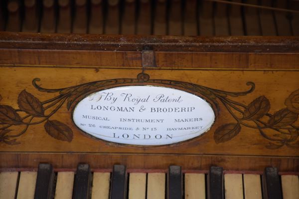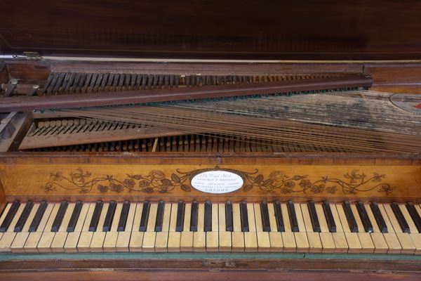 Di forma rettangolare in mogano cubano, bordato in legno satinato color miele, con festoni floreali intarsiati e placca smaltata a marchio Longman & Broderip. Quattro gambe a plinto, rastremate verso il basso con ruotine. Piccole mancanze, finiture in bronzo e tasti con placche in avorio.