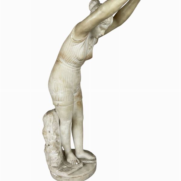 Scultura in volume di nuotatrice, in alabastro bianco di Volterra. Scollatura alla base. Mani restaurate