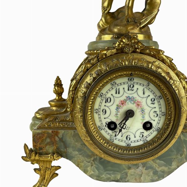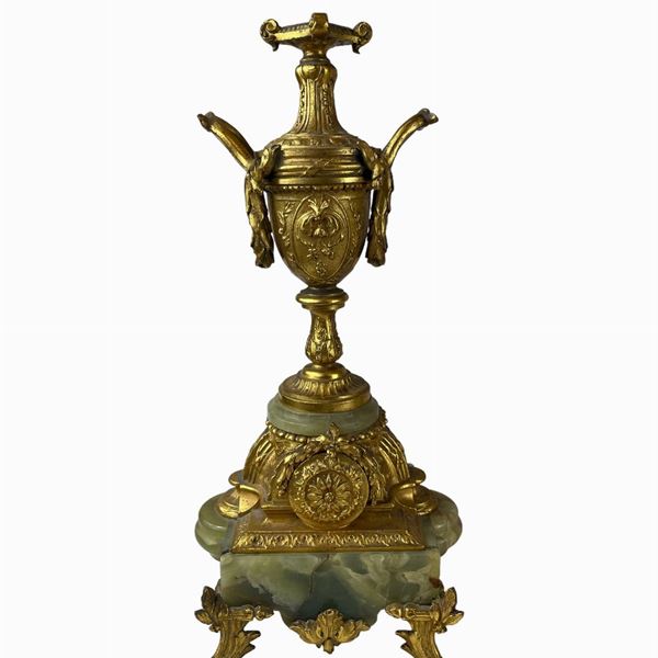 Trittico orologio a pendolo in metallo dorato ed onice, composto da orologio e statua di Diana e finiture a foglia e a pomoli. Con coppia di candelieri en suite a forma di vaso su base onice a quattro piedi di appoggio. Parti mancanti e rotte. Macchina non marciante. Francia, fini XIX- inizio XX. Misura candelieri 32 x 13 x 13 cm