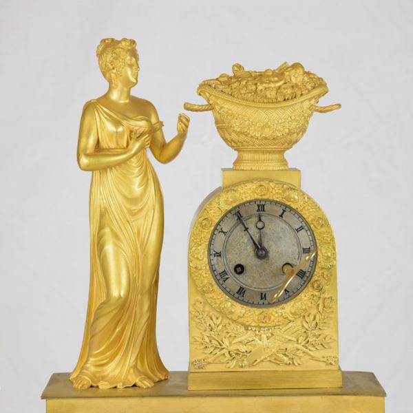 In bronzo dorato e cesellato, con figura femminile e cupido dormiente. Meccanica a filo revisionata e funzionante.
