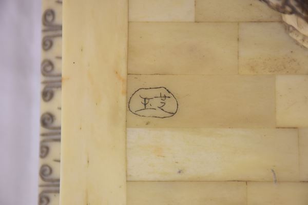 Scultura in volume con due personaggi e un pesce, carpa, su base rocciosa. Parti incise, parti a rilievo. Firmata alla base