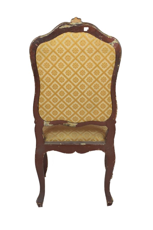 In legno a lacca marrone, con beccatura in argento ed oro, gambe a virgola, alzata a palette. Parti scolpite a motivi floreali. Laccatura in parte usurata, in parte mancante.