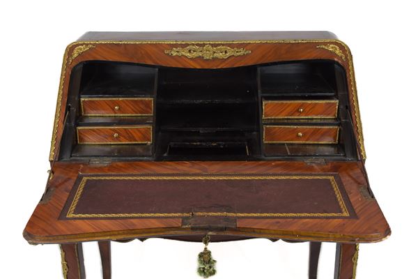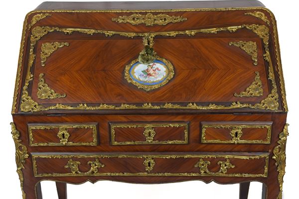 Da parte, di forma rettangolare con quattro gambe a virgola, tre cassetti sulla fronte, con calatoia e carabattola all'interno con quattro cassetti e a segreto. Lastronata in legno di amaranto e bois de violette, con finiture in bronzo dorato a raceni e placca di porcellana sul fronte della calatoia. Francia, seconda metà XIX sec.