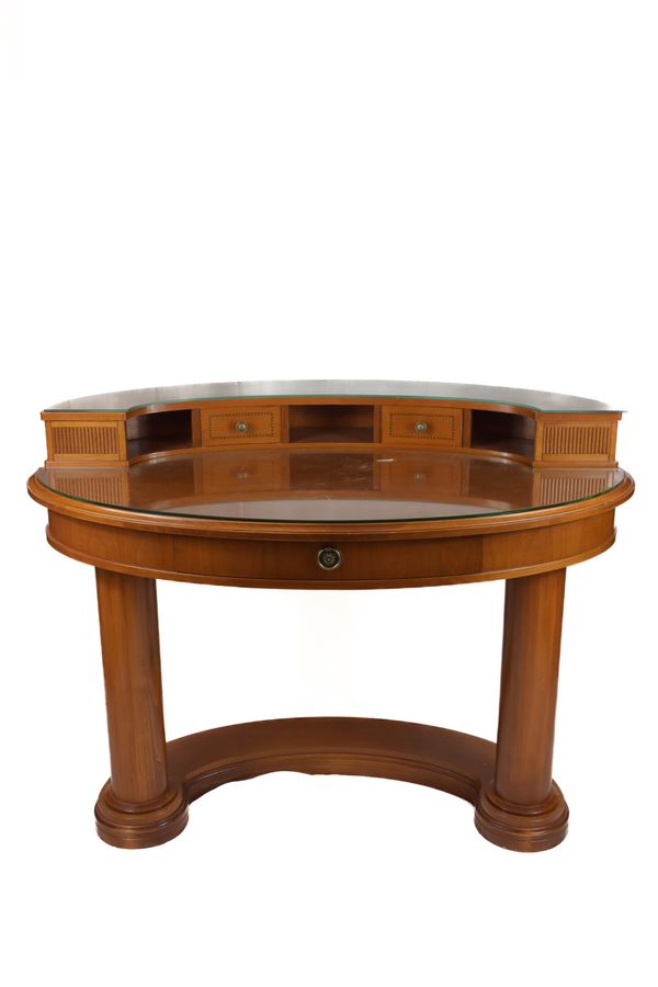 In legno di ciliegio, di forma ovale, corpo rialzato, su due colonne circolari, con un cassetto nella fascia marcapiano, e due cassetti sull'alzata del piano. Copri piano in vetro, base con fascia che raccorda le due colonne.