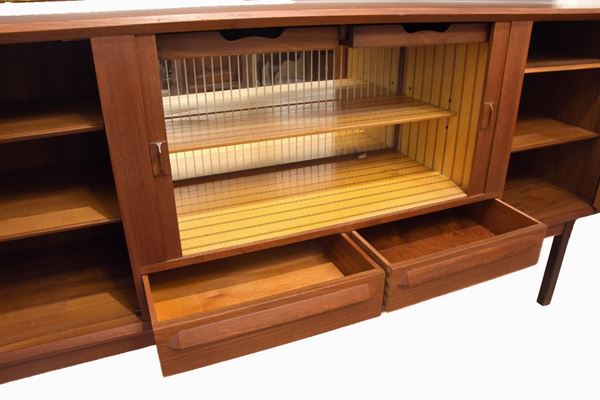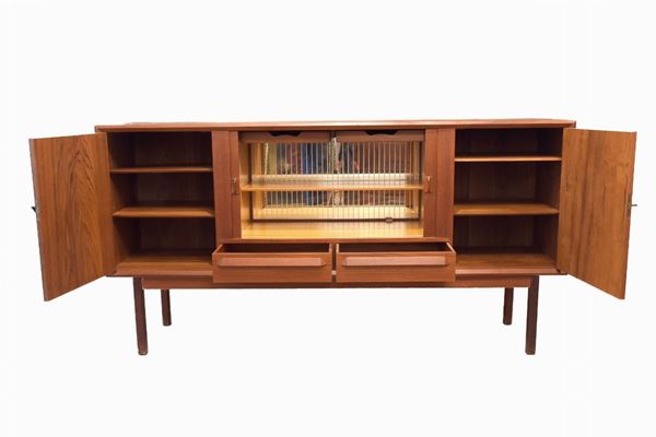 di forma rettangolare, in legno di palissandro, quattro piedi a plinto, con due sportelli a vantaux e una persiana a scorrere sulla parte superiore, e due cassetti nella fascia marcapiano. All'interno della parte centrale, rivestimento in legno di acero, con un ripiano regolabile e due ripiani regolabili negli scomparti laterali. Manifattura scandinava