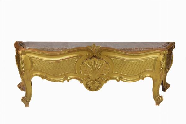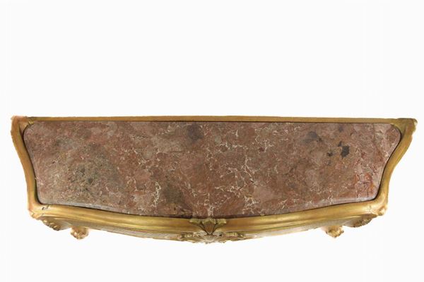 Fioriera con specchiera in legno dorato, parti scolpite con motivi floreali e conchiglia, gambe a virgola desinenti a ricciolo, specchiera rettangolare con cimata scolpita a motivi floreali e scudetto con iniziali sormontato da corona. Piano della fioriera chiuso da lastro in materiale lapideo.