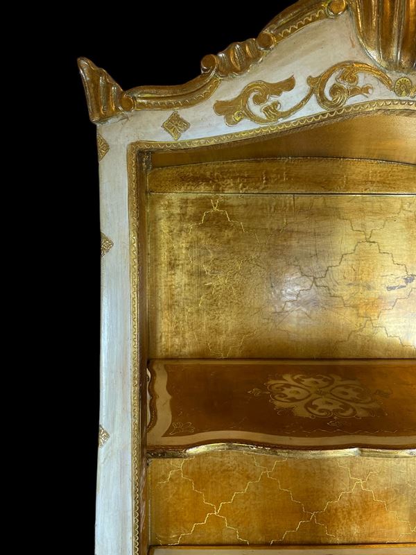 Vetrina espositrice con sportello e a tre ripiani, in legno dorato e laccato. Base a tre cassetti di forma bombata con quattro gambe a virgola.