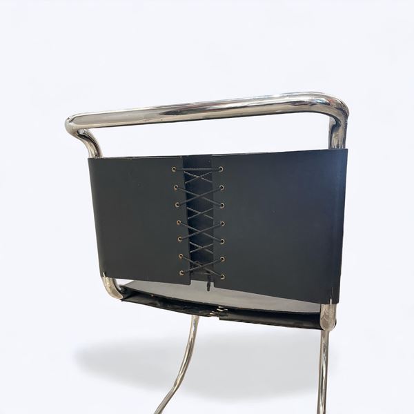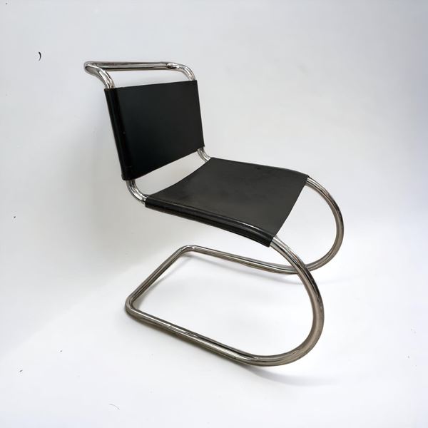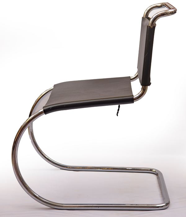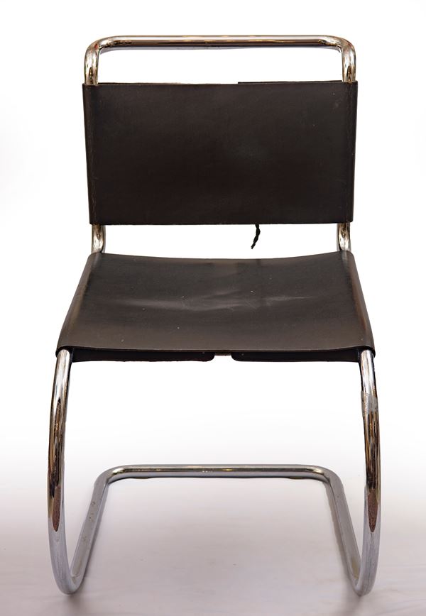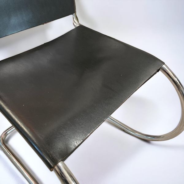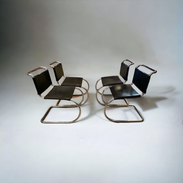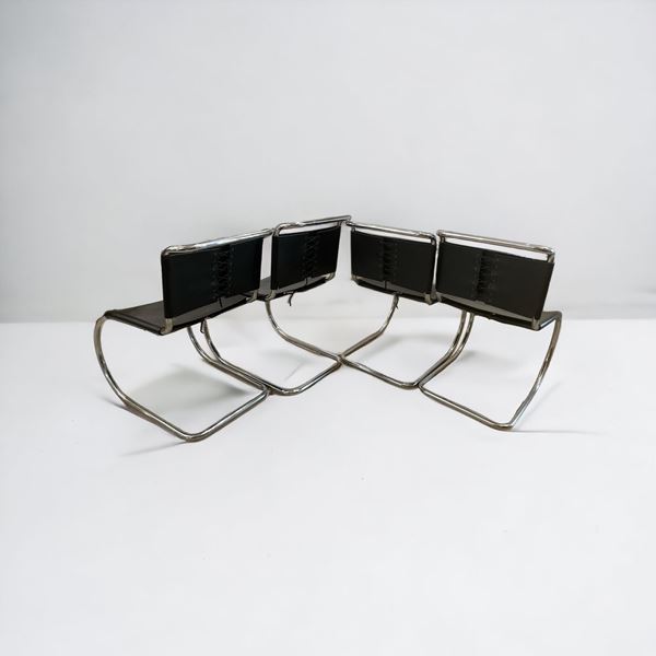 Raro set di 12 sedie MR 10, prodotte da Knoll International. Struttura in tubolare cromato con seduta e schienale in cuoio. Buone condizioni generali.