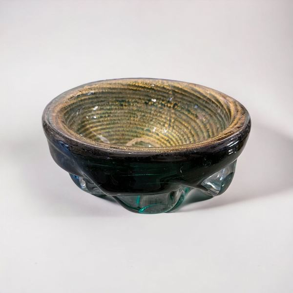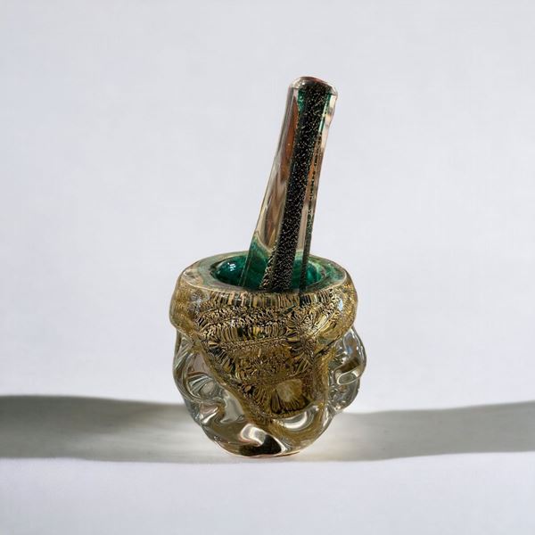 Nello stile di Seguso. Composto da una ciotola con pestello (7,5 x 16,5 cm) e due posaceneri.