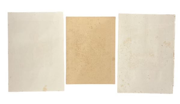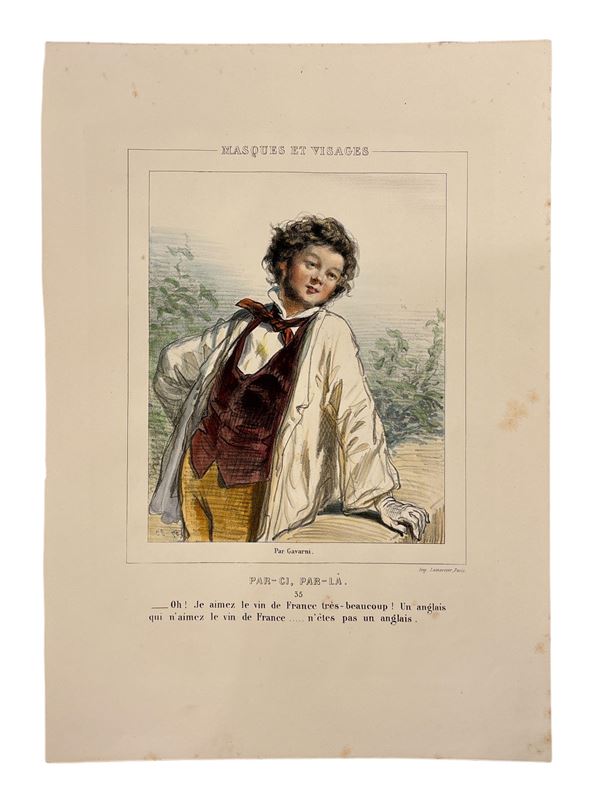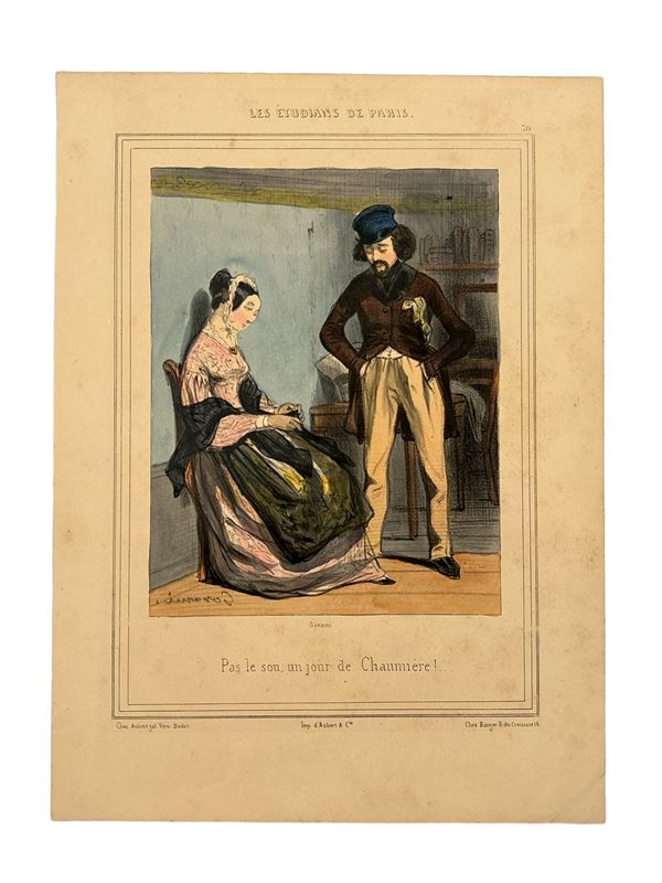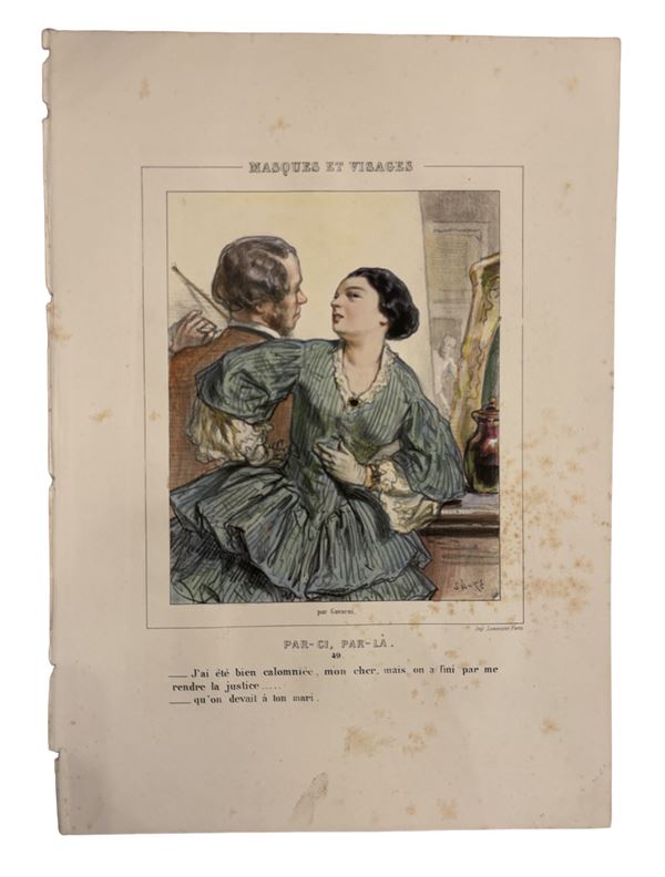 "Par - ci, par là", lastra n. 35 e n. 49 dalla serie "Masques et visages". Dimensioni foglio: 38,6 x 27,6 cm. "Pas le sou, un jour de Chaumière" dalla serie "Les étudians de Paris". Dimensioni foglio: 33,2 x 24,3 cm.