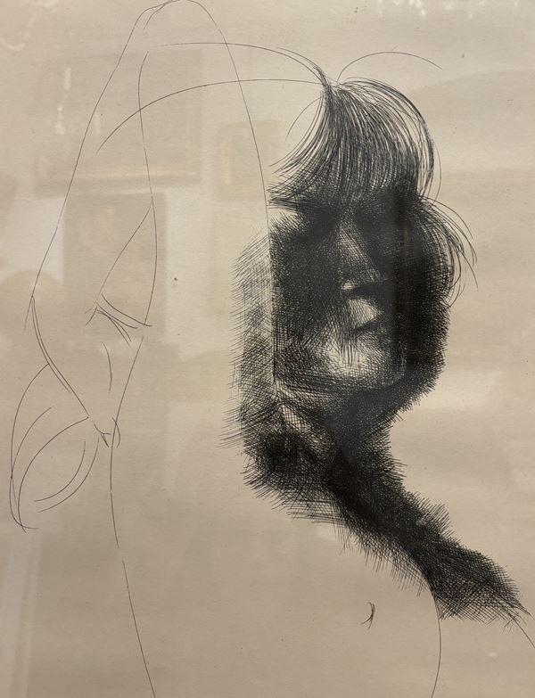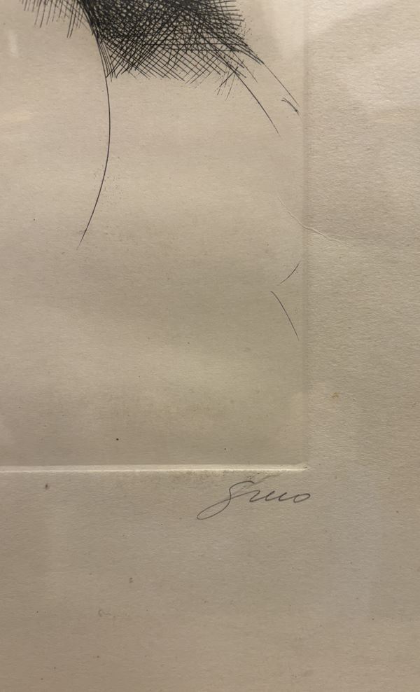Es. n. 71/100. Firmato e numerato a matita dal Maestro. In cornice. Macchia di umiditΓ nel margine inferiore sinistro, piccoli buchi nella parte superiore. In cornice.