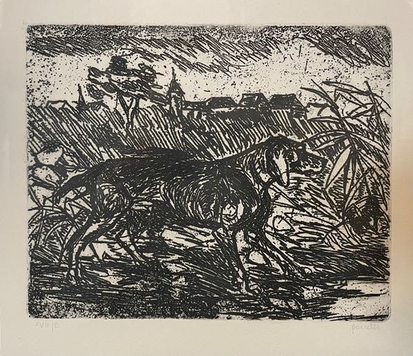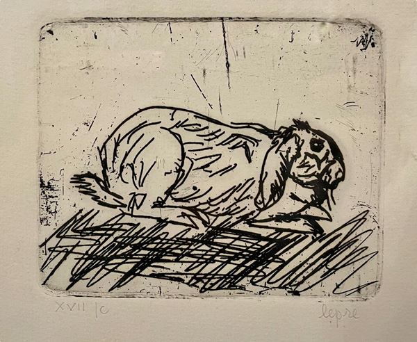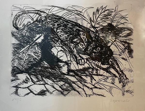 5 acqueforti originali di Ligabue, non firmate, incorniciate: "Autoritratto", "Leopardo che striscia", "Lepre", "Lotta di galli", "Pointer con paesaggio notturno" (cm 21,5x18; 17,5x23; 9,5x12; 29,5x26; 19,5x24,5). Incisioni numerate e titolate. Sul retro di ogni singola stampa etichetta con informazioni riguardanti l'incisione e le varie tirature, con riproduzione della firma di Ligabue