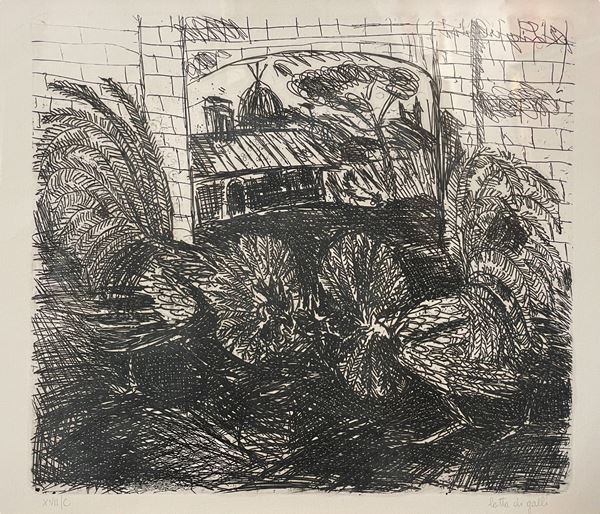 Insieme di 5 acqueforti originali tratte da "Laccabue, Ligabûn, Ligabue", anni '50 del XX secolo