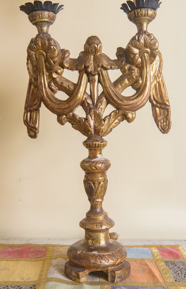 in legno dorato e intagliato, a due luci. Adattate a lampade d'appoggio.