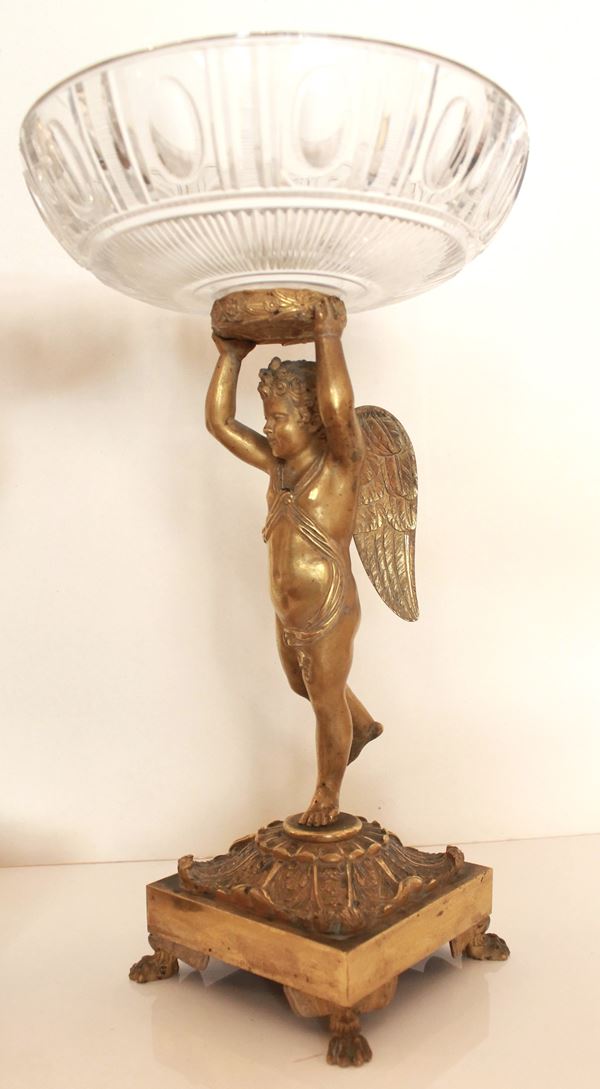 Base quadrata con piedi ferini e fusto raffigurante un amorino. Coppe in vetro molato. Manifattura francese.