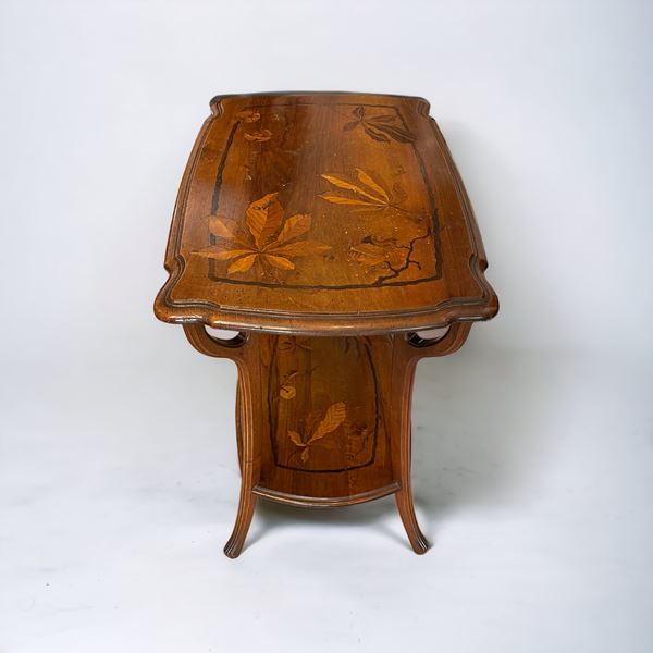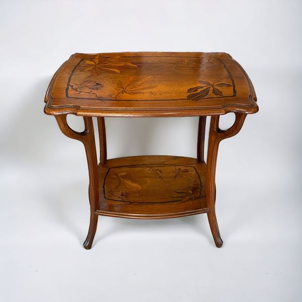 Tavolino a due ripiani con piano superiore centinato, in legno di noce con intarsi in legni pregiati. Firmato a intarsio: Gallé.