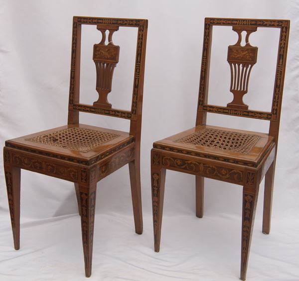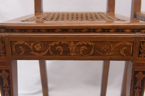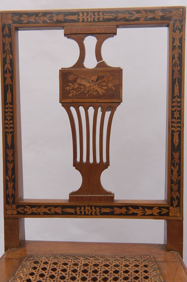 In legno di ciliegio con intarsi in bosso e legni di frutto entro riserve in pastiglia, sedute in paglia di Vienna e schienale traforato, decori a motivi floreali. Difetti.